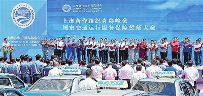 ■昨日,参与上合青岛峰会城市交通运行服务的保障人员代表在会上宣誓。 新华社照片