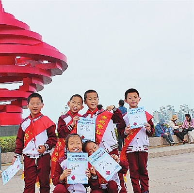 ■枣山小学在各年级学生中开展不同形式的“迎上合”活动。图为学生们在五四广场发放宣传材料。郭菁荔 摄